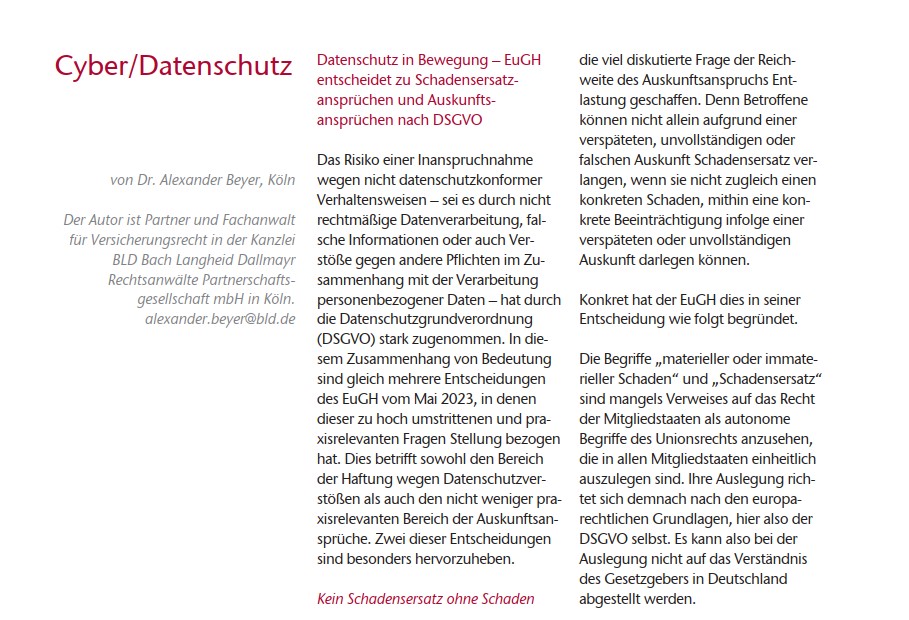 BLD-Partner Dr. Alexander Beyer hat in der Zeitschrift PHi 2023, 3-4/2023, 86 ff. einen Beitrag veröffentlicht. Darin beschäftigt er sich mit zwei EuGH-Entscheidungen aus Mai 2023 zu grundlegenden Fragen der DSGVO.