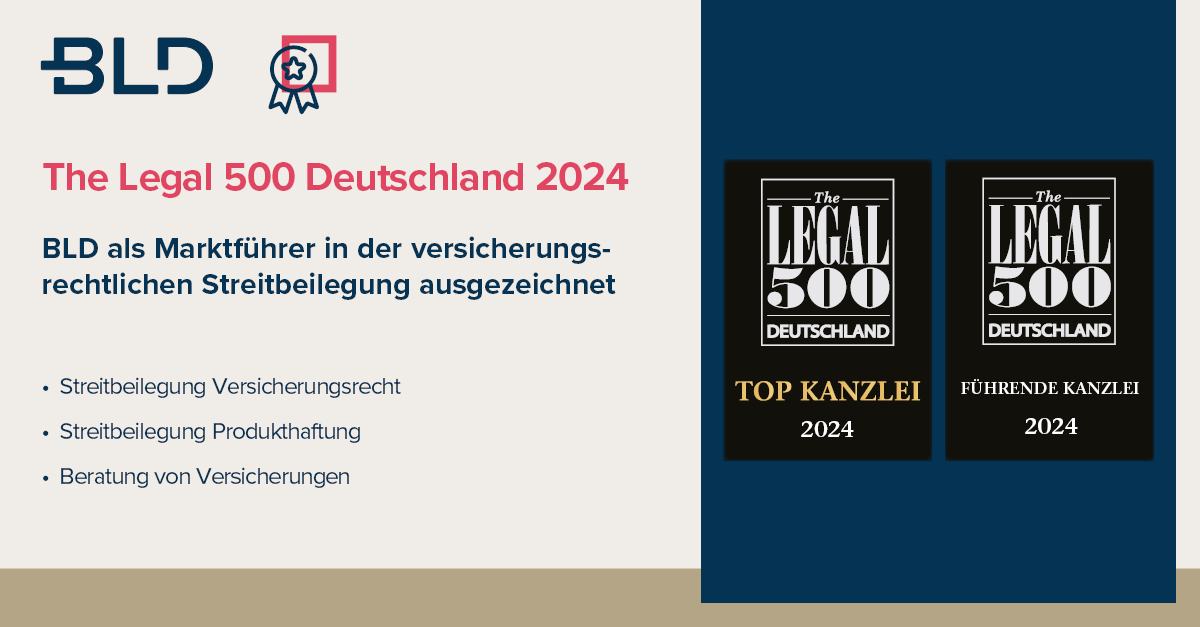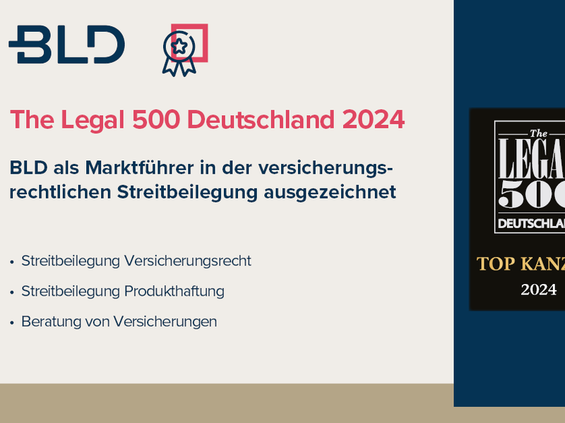 Wie schon in den vergangenen Jahren wird BLD auch 2024 in der versicherungsrechtlichen Streitbeilegung als marktführende Kanzlei ausgezeichnet. Die von The Legal 500 befragten Kontakte loben durchgehend die starke Kombination aus hohem Fachwissen und pragmatischer Beratung. „BLD zeichnet sich nicht nur dadurch aus, dass die Kanzlei schon über viele Jahre hohe Fachkompetenz in allen Bereichen des Versicherungsrechts aufrecht erhält, sondern vor allem dadurch, dass sie dieses Fachwissen als Team auch alltagstauglich umsetzt.“ Auch für die Streitbeilegung im Bereich der Produkthaftung erhält BLD besondere Anerkennung. „Durch das breite Tätigkeitsfeld und den guten Marktüberblick bietet BLD eine verlässliche Anlaufstelle hinsichtlich aller Fragen rund um das Thema Produkthaftung und darüber hinaus. Trotz der hohen fachlichen Durchdringung verliert sich das Team von BLD nicht in akademischen Abhandlungen, sondern liefert maßgeschneiderte Lösungen für das jeweilige Problem“, so eine Referenz bei The Legal 500. Und auch die unternehmensbezogene Beratung von Versicherern wird schließlich gewürdigt und der Kanzlei „sehr großes Fachwissen, kompetente und zugleich pragmatische Beratung“ zugesprochen.