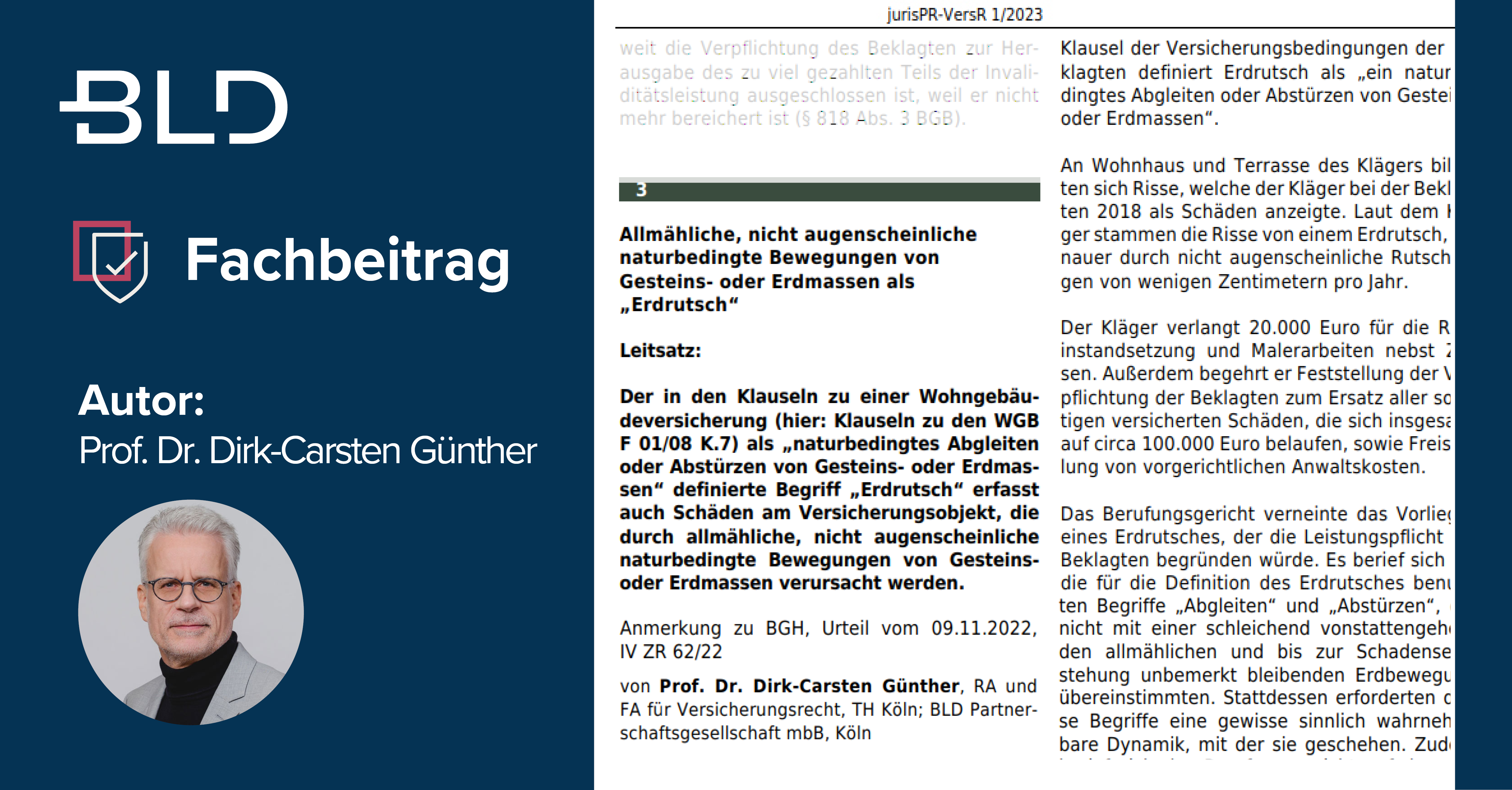 BLD-Partner Prof. Dr. Dirk-Carsten Günther hat sich im juris PraxisReport Versicherungsrecht 01/2023 mit einer Entscheidung des BGH vom 09.11.2022 (IV ZR 62/22) auseinandergesetzt. Das Gericht hatte die Frage zu klären, ob auch allmähliche, nicht augenscheinliche naturbedingte Bewegungen von Gesteins- oder Erdmassen von dem in Wohngebäudeversicherungsklauseln definierten Begriff „Erdrutsch“ erfasst sind, wobei dort alte AVB der Entscheidung zu Grunde lagen, in denen es u. a. hieß „Abgleiten oder Abstürzen“.