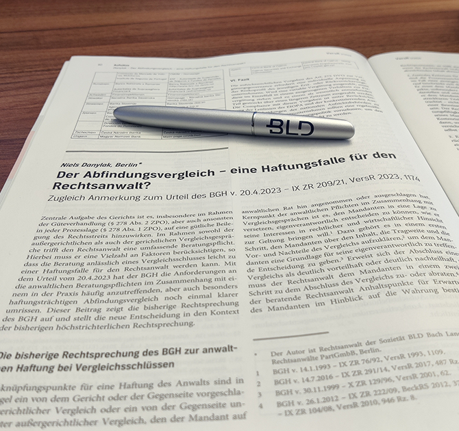 Kann die umfassende Beratungspflicht schnell zu einer Haftungsfalle für Rechtsanwältinnen und Rechtsanwälte werden? In der zweiten Ausgabe 2024 der Zeitschrift für VersR (VersR 2024, 80 ff.) kommentiert BLD Senior Associate Niels Danylak die Entscheidung des BGH vom 20. April 2023 (IX ZR 209/21), in der es um einen solchen Sachverhalt geht. Die neue BGH-Entscheidung stellt Danylak in den Kontext der bisherigen Rechtsprechung.